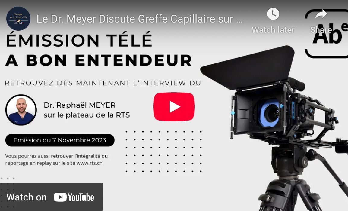 Découvrez notre sélection de reportages et interviews réalisés par des médias reconnus comme la RTS et Le Figaro mettant en lumière l'expertise de la Clinique du Cheveu. Ces vidéos vous permettent d'approfondir votre compréhension de nos techniques innovantes et d'entendre les témoignages de patients satisfaits.Pour accéder à davantage de contenu exclusif, nous vous invitons à visiter notre chaîne YouTube officielle.Vous y trouverez des interventions du Dr Meyer, des explications détaillées sur nos procédures, ainsi que des interviews complètes qui vous donneront un aperçu complet de notre approche et de nos résultats.Abonnez-vous pour ne manquer aucune de nos nouvelles publications !